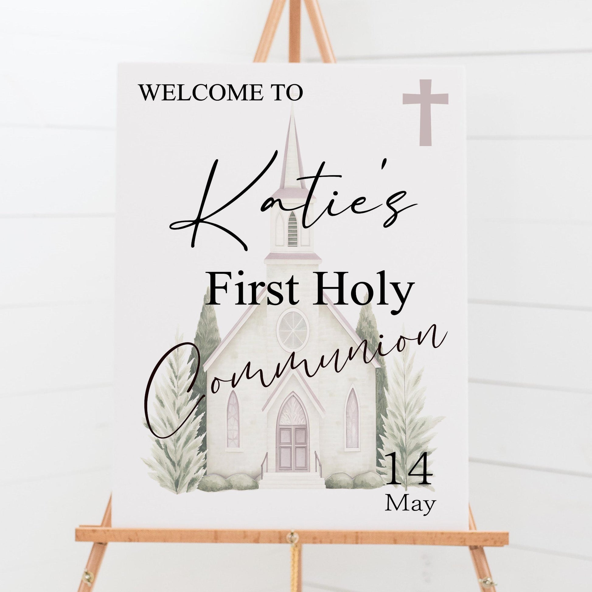 Welcome your guests to your first holy communion party with this beautiful welcome sign, perfect for celebrating your child's special day.