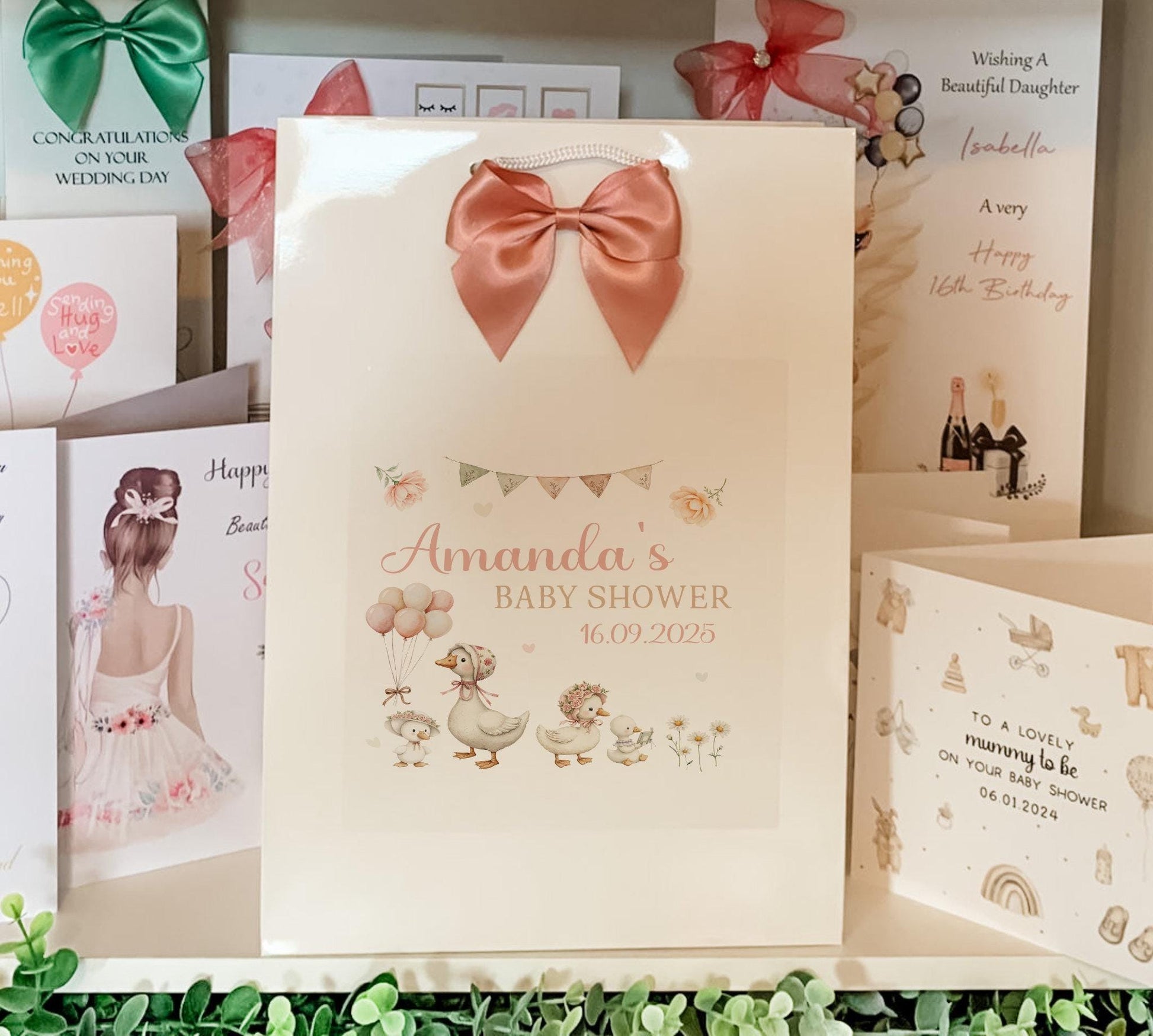 The personalisation is printed on a white label and carefully applied to the bag, while a coordinating bow adds a special touch.