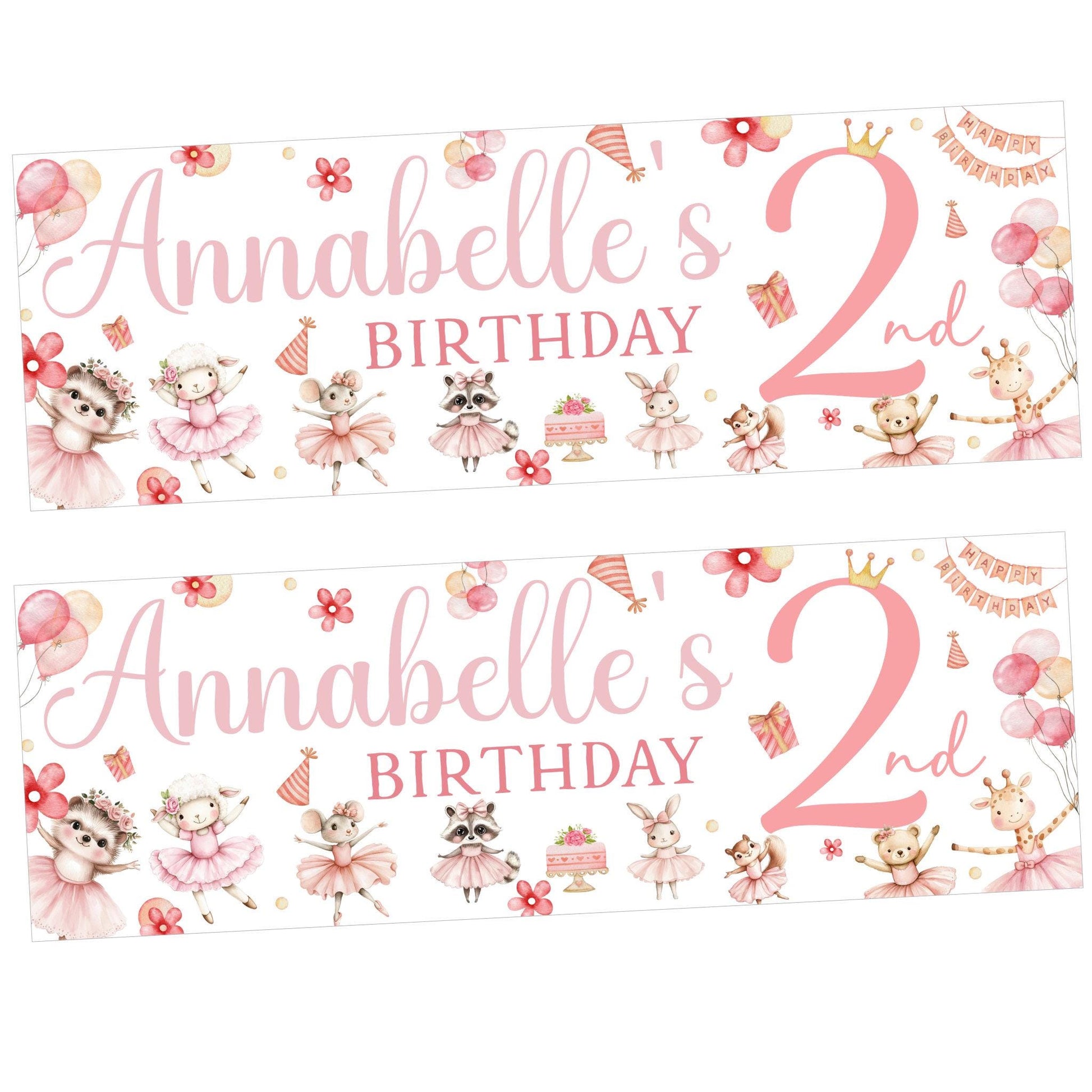 Perfect for children's parties, the banner is decorated with a colourful pastel ballerina animal design. It can be personalised with a name, making it a special keepsake.