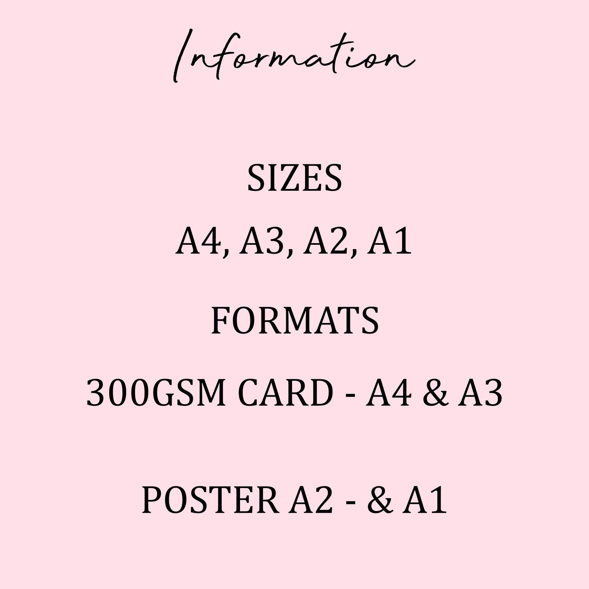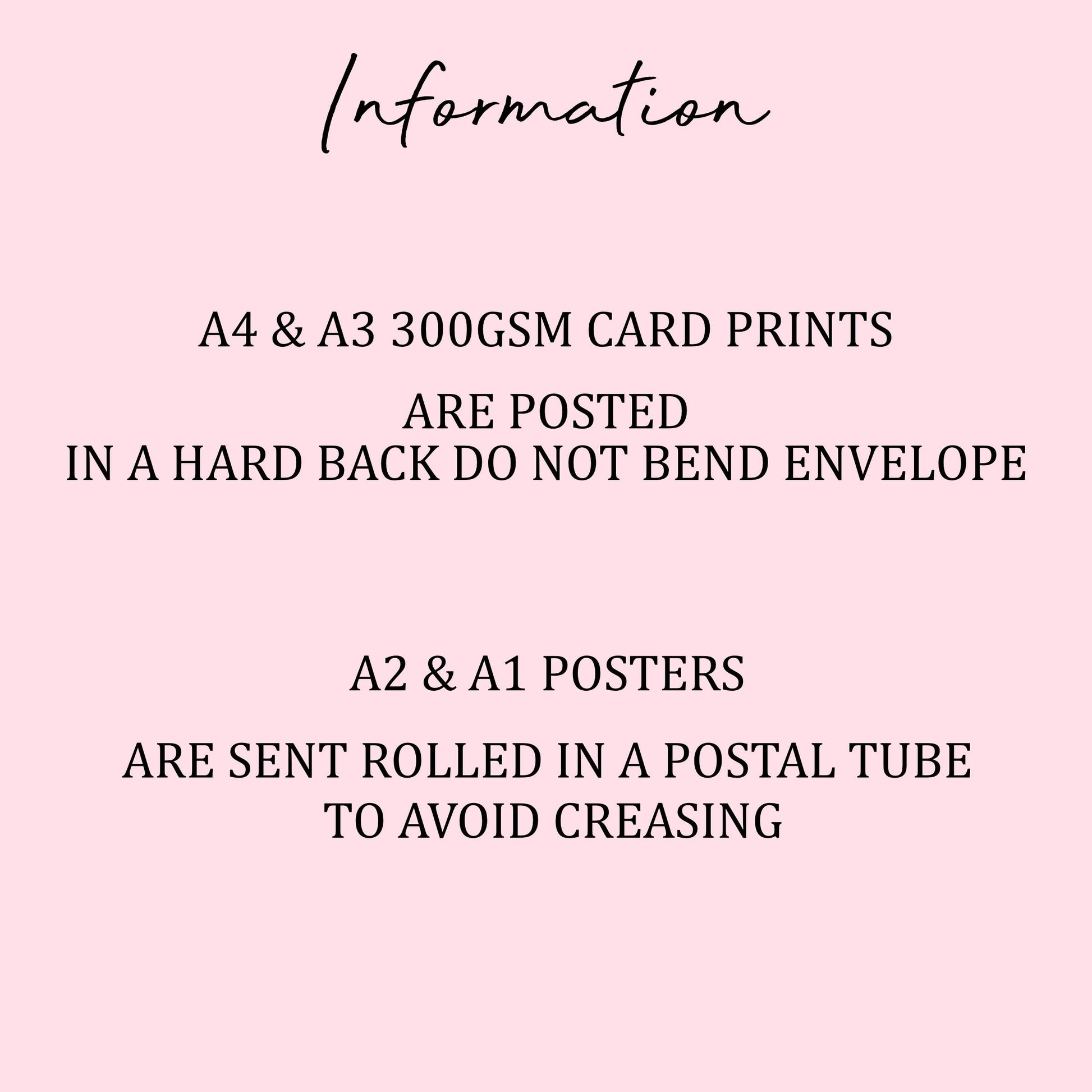 A2 - 420mm x 594mm - Printed onto 180gsm poster photo paper (this will not stand up on its own) sent rolled in postal tube
