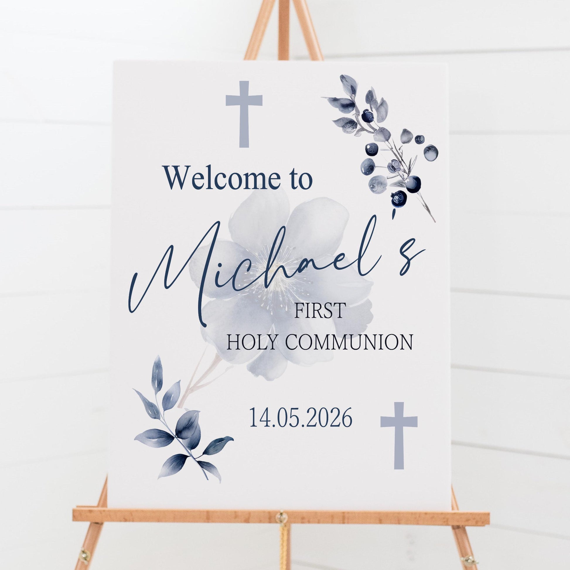 Welcome your guests to your first holy communion party with this beautiful welcome sign, perfect for celebrating your child's special day.