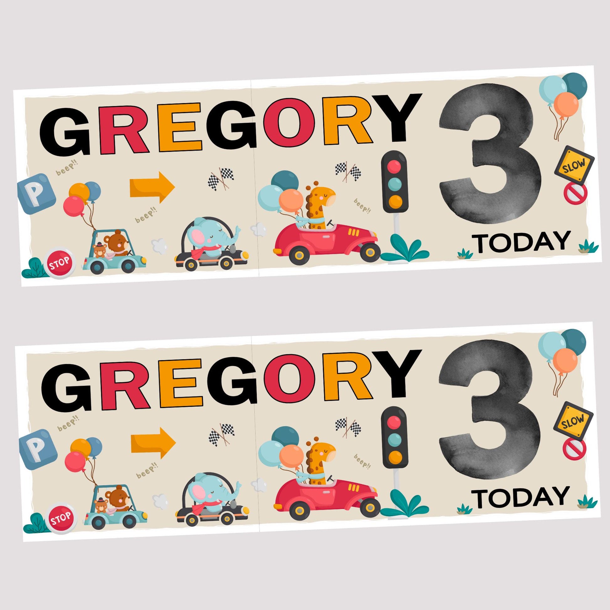 Personalised Happy Birthday Party Banner, Party Decor, Add Name Age, Fun Car Animals Theme